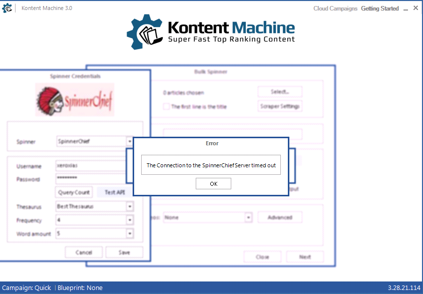 It looks like my account is upgraded. However i am still not able to use the api key in Kontent Machine. every time i try it use it i get " The connection to SpinnerChief server is timed out " message. image attached.