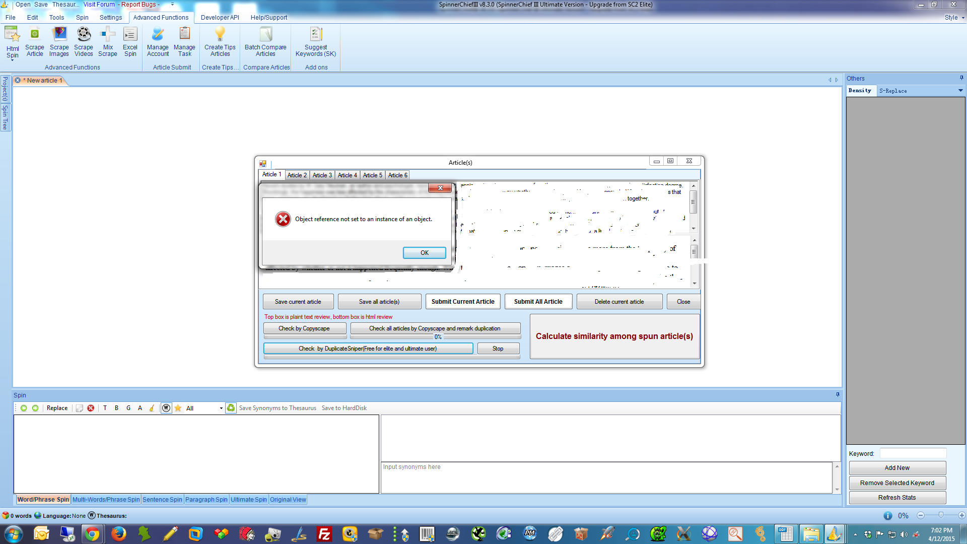 I have tried to batch compare articles and then check an individual article/all vs copyscape and keep getting an error message saying "object reference not set to an instance of an object."