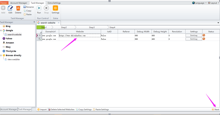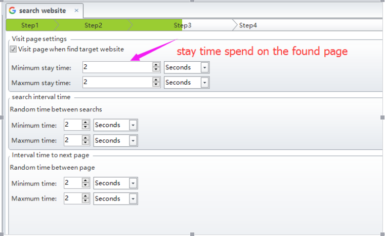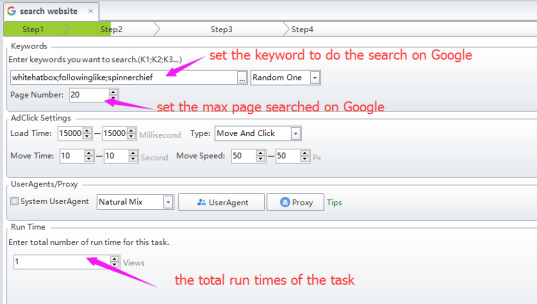 Create a task under "Google" tab, then enter your website link in "Website" filed, then click Next button to setup settings for the next page. You can enter the search keyword in "Keyword" tab. And setup a page number in "PageNumber" filed to search your website within these search results page. You can setup a stay time spend on your page in "Load Time" filed, the unit is millisecond. And you can setup a run times in "Enter total number of run times for this task" filed. After the settings are done for this page, just click Next button to view the next page. After all are done, then you can click Start button to run it.