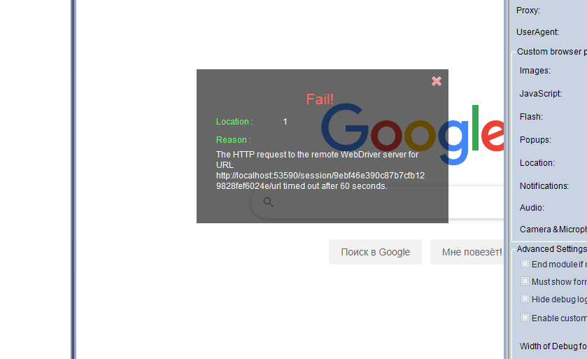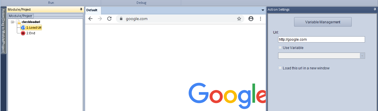 Here are the Load Url settings. Just loading the google homepage. Please note that the page successfully loads and displays.