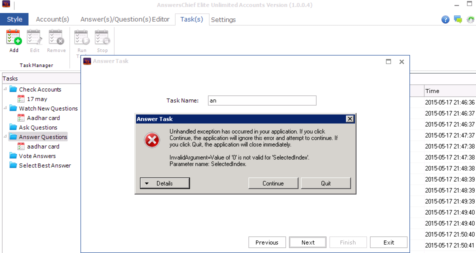 I am not able to answer to the question which i searched via - watch new question task, when i do it, i get error. i have attached screenshot pl check.