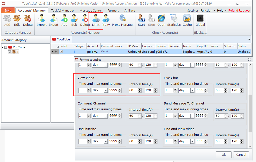 Nice, and how do you set so that every account only watch one time or maybe 2 times or more for each video?,And can you set every account to watch only one time per video..and set the interval time for an account to enggage to next video, example 1 account randomly pick to watch from 200 videos, and after finish watching, the account have to wait another 20 - 30 seconds to watch different video, and so on until that account finish watching all videos in random, and the same thing with the rest 999 accounts, since im going to put 1000 accounts. And this action will loop or start again from begining to each account. I hope you understand what im trying to say.thanks, your help will be very much appreciate