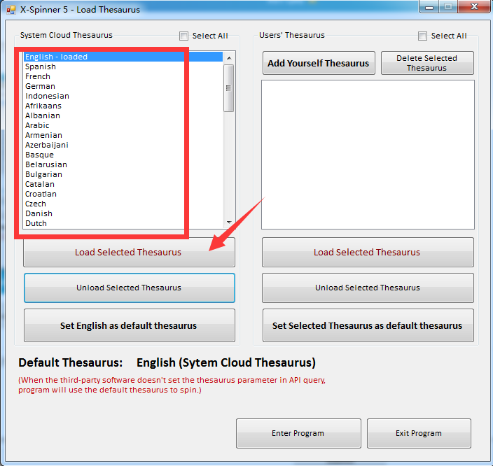 After you open X-Spinner, you can select the cloud thesaurus you need to load. The cloud thesaurus in X-Spinner is the same as that in SpinnerChief 6.