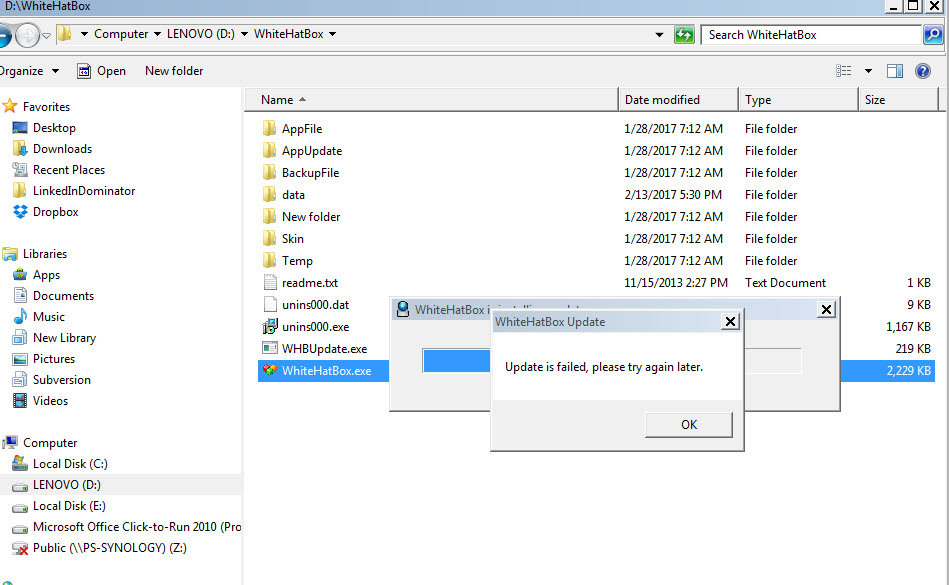 Hi, We are sorry for any inconvenience this has caused you. I advised you to reinstall whitehatbox app, at the same time, don't save it in Disk c, put into other disk. Maybe,you can resolve your problems. If still can't install whitehatbox app, please feel free to contact us.