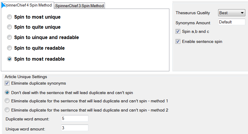 On a different issue, once I Super Spin it, I click on Spin, choose "Don't use original word", and spin it. Once I've done it, I clicked "check by DuplicateSniper...". I always get "great!No duplicate found!". Is it comparing the spun articles with the original article? I ran the spun article in the standalone DuplicateSniper, there's a lot of duplicate showing up there.