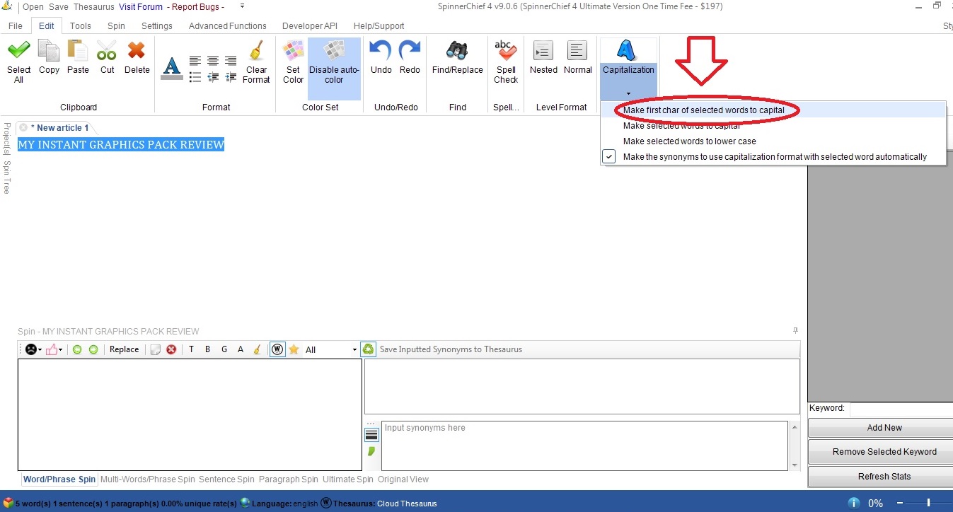 I have been using spinner chief and upgrading since SC 2. And ever since them I have been wishing this feature works as it would save me lots of time and saw the feature in the software, but whenever I try to use the edit tabs feature under "captilization" to "make first char of selected words to capital" it does nothing and does not work. This feature would be an amazing time saver because It's perfect for quickly make sentences in caps or not cap into good titles.