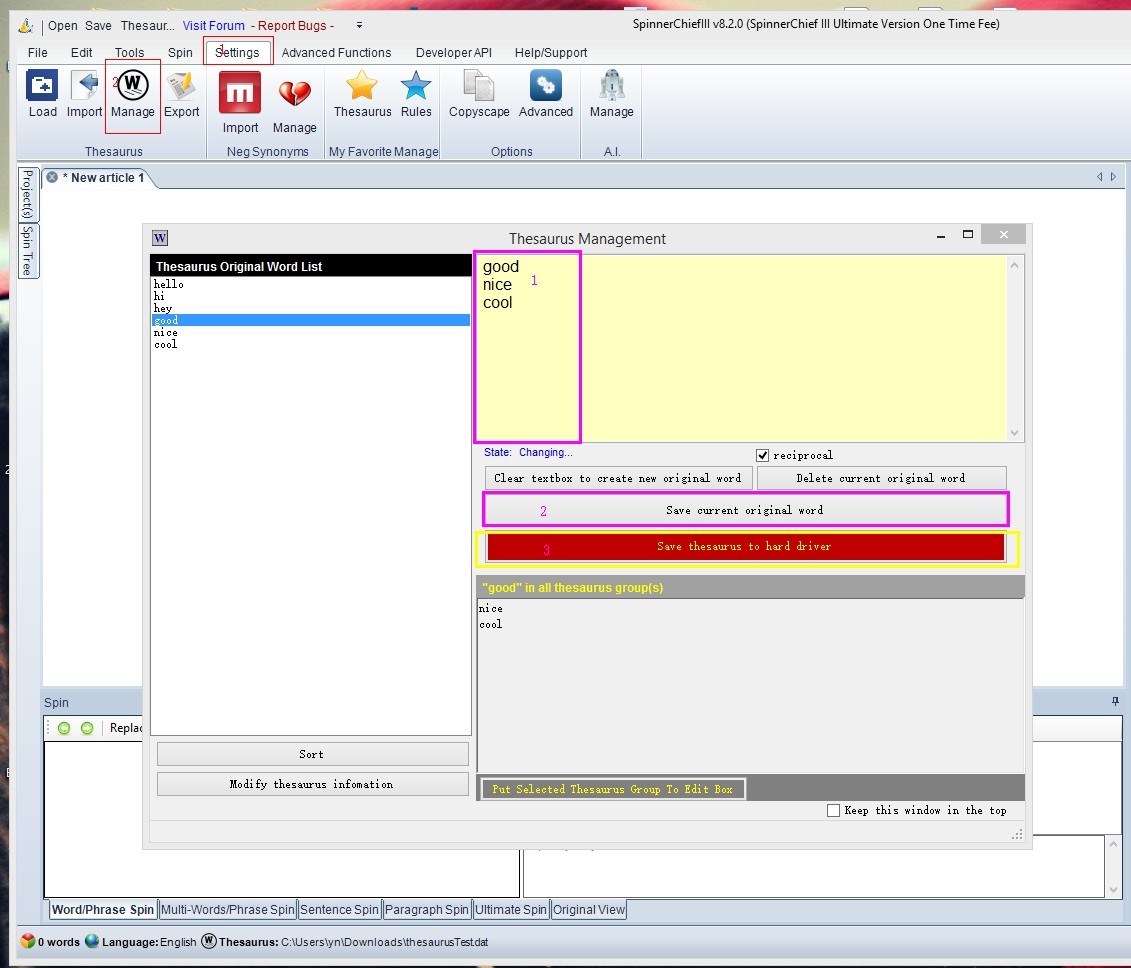 1. Edit synonyms in Thesaurus Manager - Settings>Manage . There you can add/delete/modify synonyms. After all changes, you need click the red button "save thesaurus to hard driver" to save it.