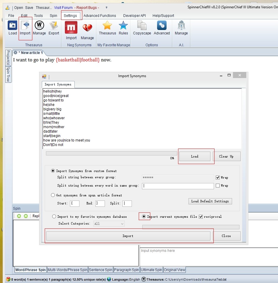 2. Import synonyms into thesaurus directly. Settings>Import