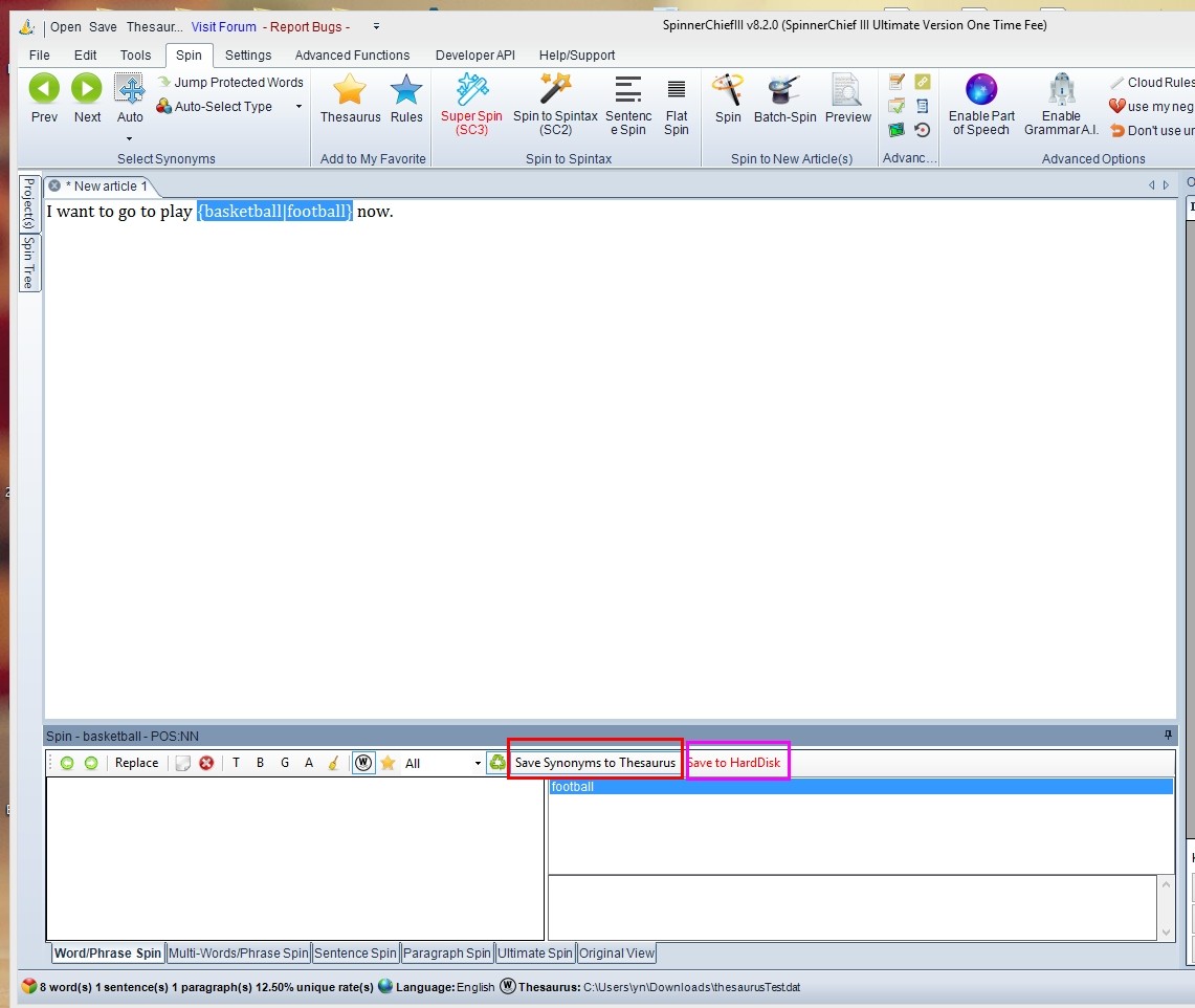3. Add synonyms directly when deal with article. Checked the "Save Synonyms to thesaurus" button when add synonyms manually, then the added synonyms will be saved to memory automatically. If you click "Save to Hard Disk" button, all added synonyms in the memory will be saved to hard disk (thesaurus file)