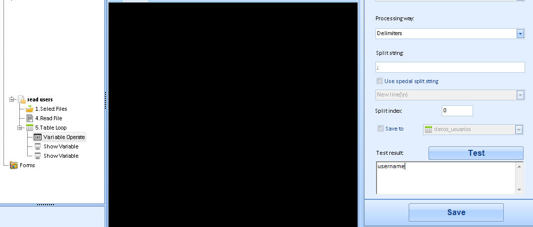 I loop in the table, and try to use variable operate to split each the first line, and save in three string vars (username, email and password), but i cant make it (the test work fine)
