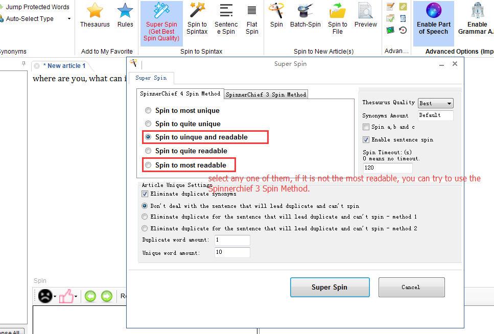 But facing the same problem!! Also, I am not getting the human readable spin article. Could you let me know how can get the human readable spinning article?