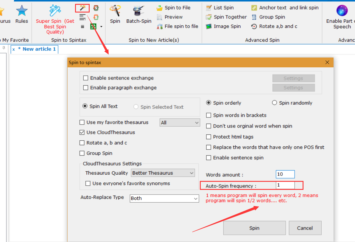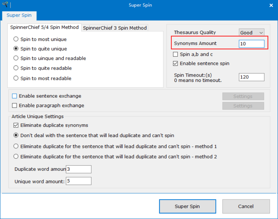 So her once again for better understanding. The same sentence. Once in German, and in English. In German SpinnerChief spun 2 words. In Englisch SpinnerChief spun 6 words. So while "men" was spun in English the same word "Manner" stays untouched in German. Any Idea how to increase the amount of spun words in German?