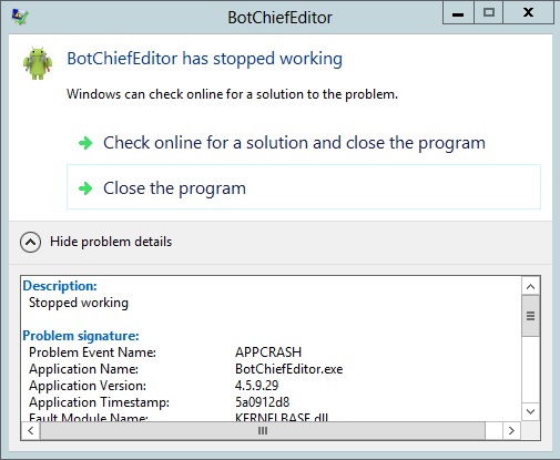 I haven't used my BotChiefEditor and BotChiefRunner for months. Now, after I finally got some time and new ideas for bots I receive the following error message (screenshot attached). The software fails to start and I have run out of ideas of what to do. I have even tried to update to the newest version and I have the same error message (I originally got this message with one of my compiled bots that worked just fine in the past).