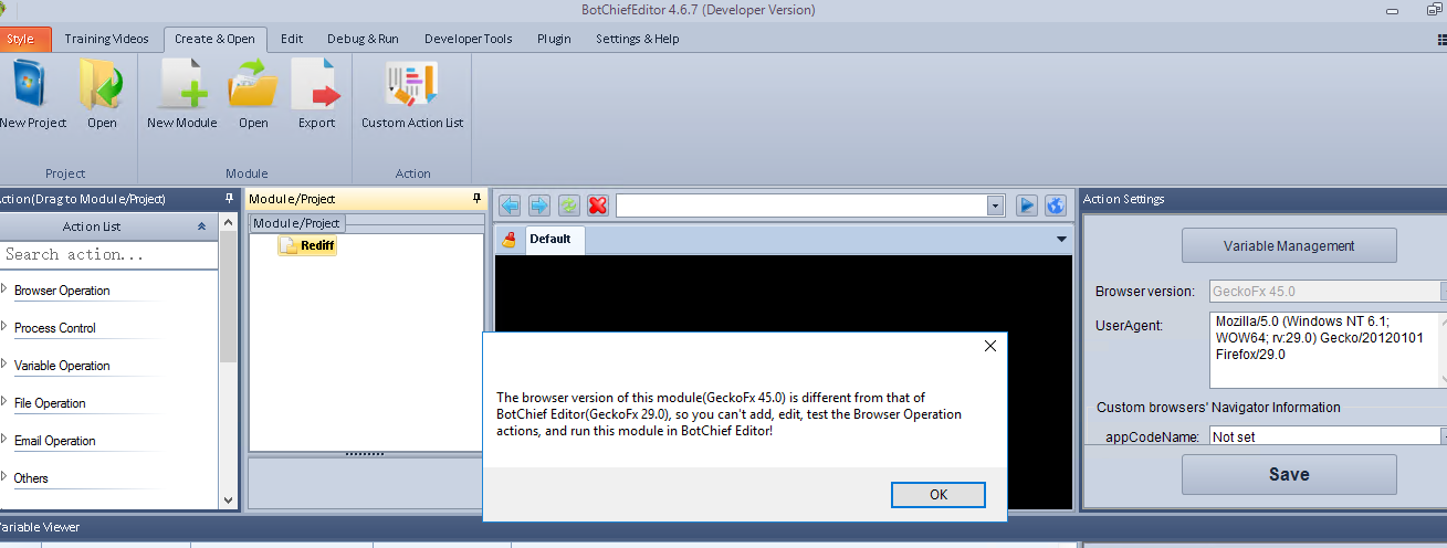 I was trying to create a new mail sending template in black bulk mail based on rediff mail . When i started creating it in botchief . It is giving me Browser version error.