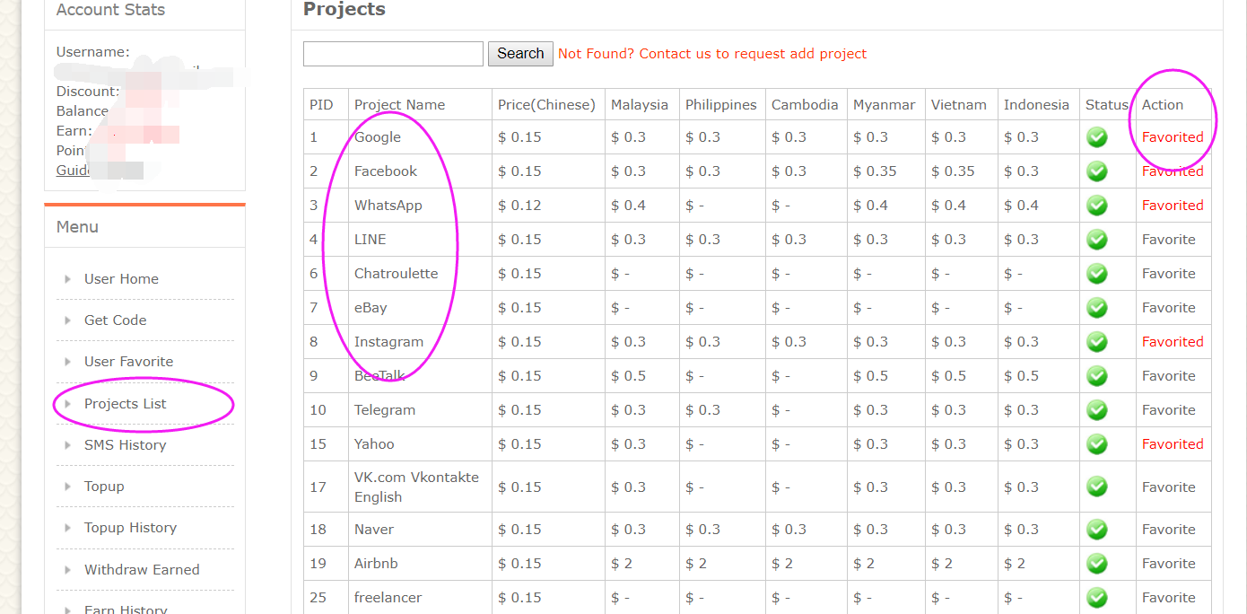 Go to favorite the service you are using in Project list in getsmscode website.