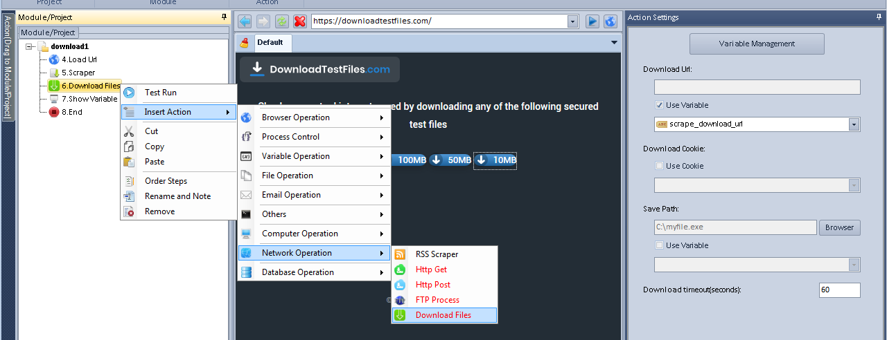 2. After that, use the action Network Operation - Download Files to save the file to the selected directory.