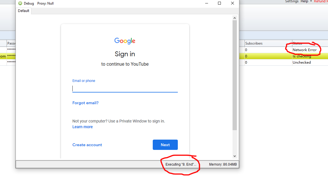 So after finally getting the program to run again, now there's a new problem, or bug: The accounts will not login to google.