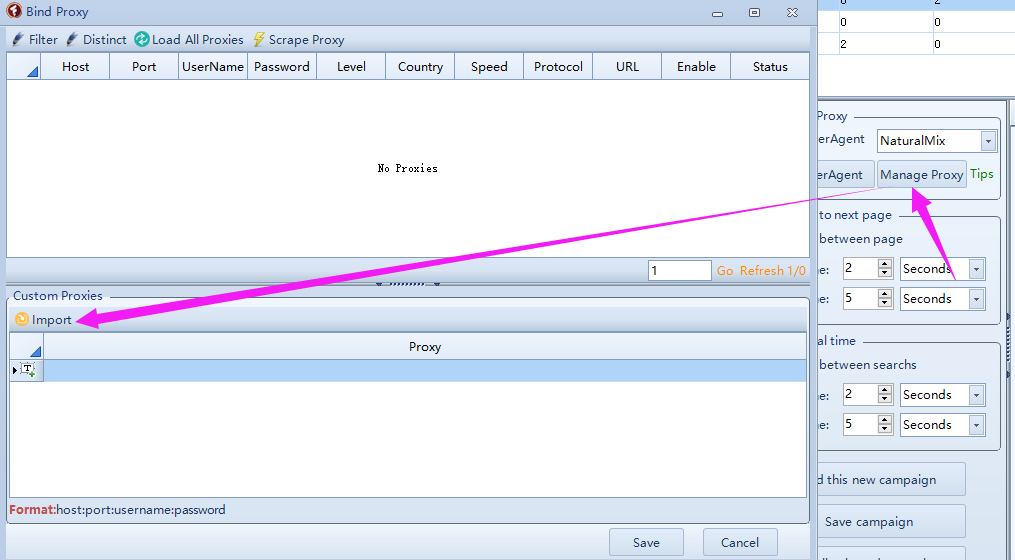 Click ManageProxy option to import/add the list of your proxies. When your campaign is running, software will auto take one to use in order.