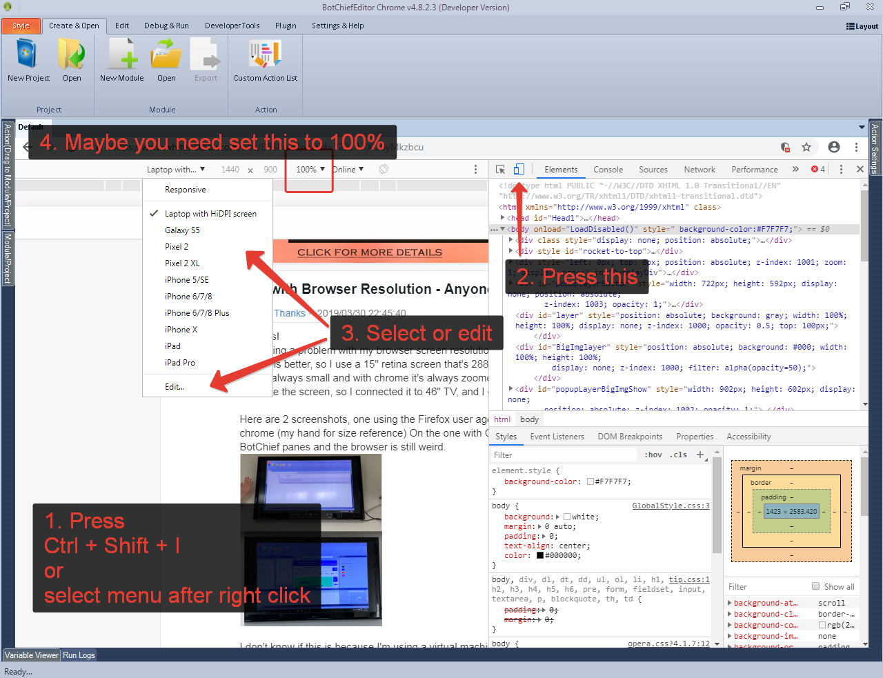 Here are 2 screenshots, one using the Firefox user agent and the other with chrome (my hand for size reference) On the one with Chrome I even unpinned all BotChief panes and the browser is still weird.
