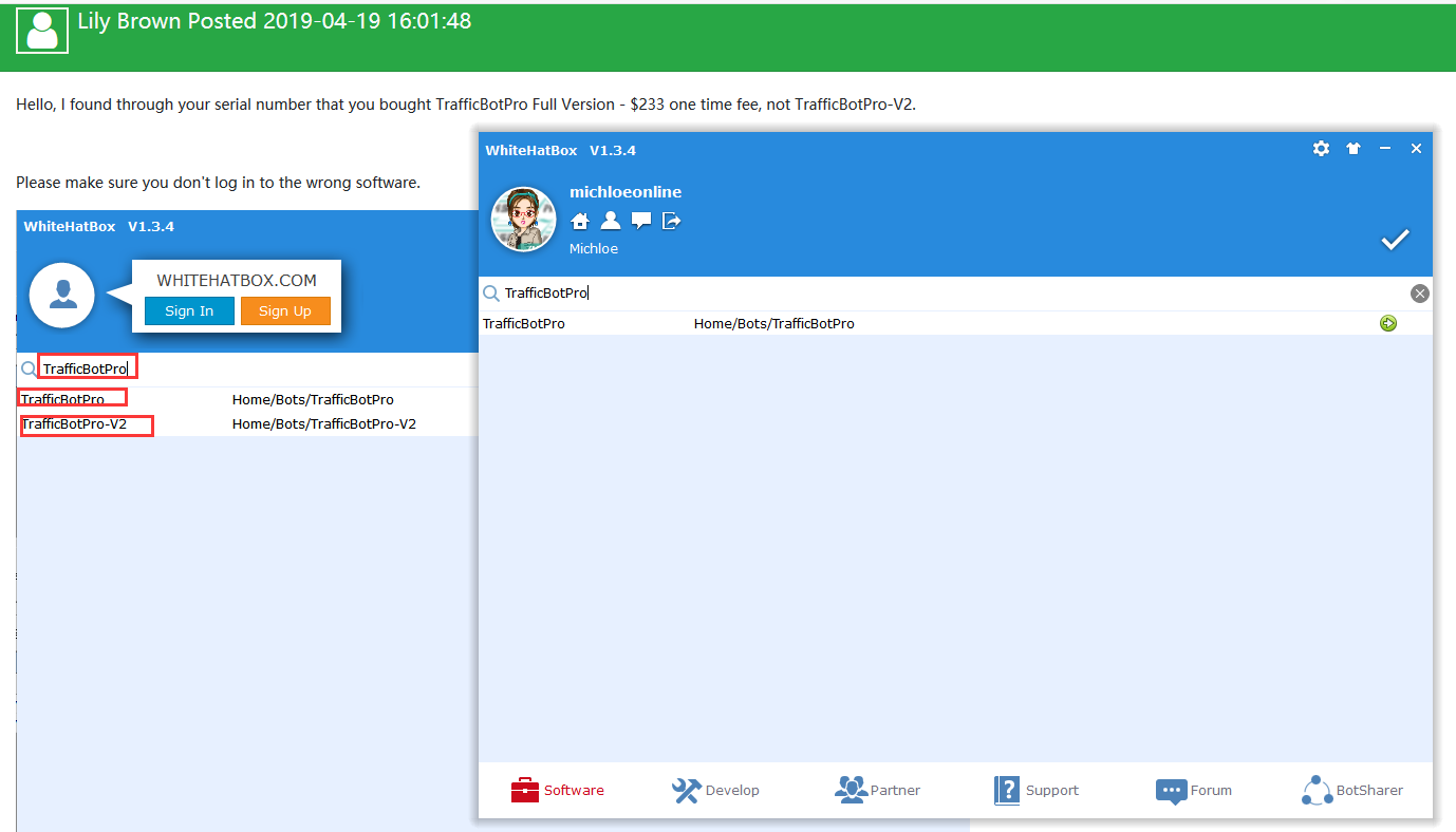 it says my "supporter" is "Lily Brown" but I have not gotten any replies since yesterday morning. When I purchased the program I was under the impression I was purchasing version 2 as I got the 55% discount for Traffic Bot Pro v2. And even on the main website www.trafficbotpro.com it clearly advertises for version 2. Then down at the bottom of the page there is no way to differentiate version 1 from 2 so I naturally assumed purchasing the full version using the version 2 discount code would get me version 2. What I would like is the version 2 that I paid for otherwise if you can't do that I would like a refund please. I also uploaded 4 screenshots in the ticket. As you can see from the screenshots below, the majority of the main page even advertises for version 2. The Traffic Bot Pro Version 2 is the one that I was purchasing, not version 1. So im not sure if it was a mistake on the web page or false advertising. I would simply be happy if I could get the correct version, otherwise please refund me if you won't do that. If someone would please take a look at my ticket I would greatly appreciate it. I have also emailed [email protected] as well as [email protected] about this problem. Waiting for a response, thank you.
