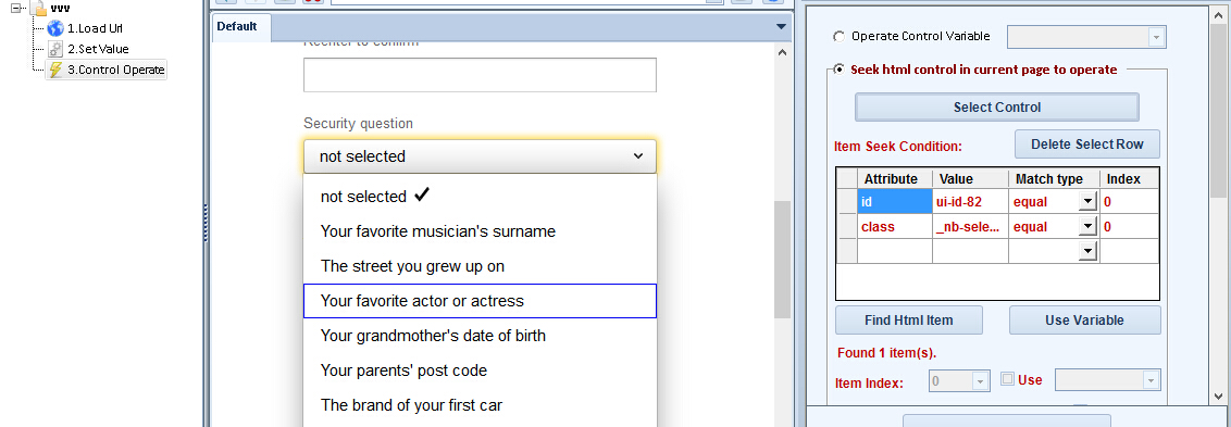 2. Click "Security question" list, then click "select control" button in the "control operation" action, then select any question in the list. like following >>