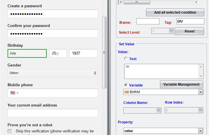 How do I select a value from a drop down menu. The List Radio options isn't available.https://accounts.google.com/SignUp? On this site, how do I select the Gender and Birthday Options....